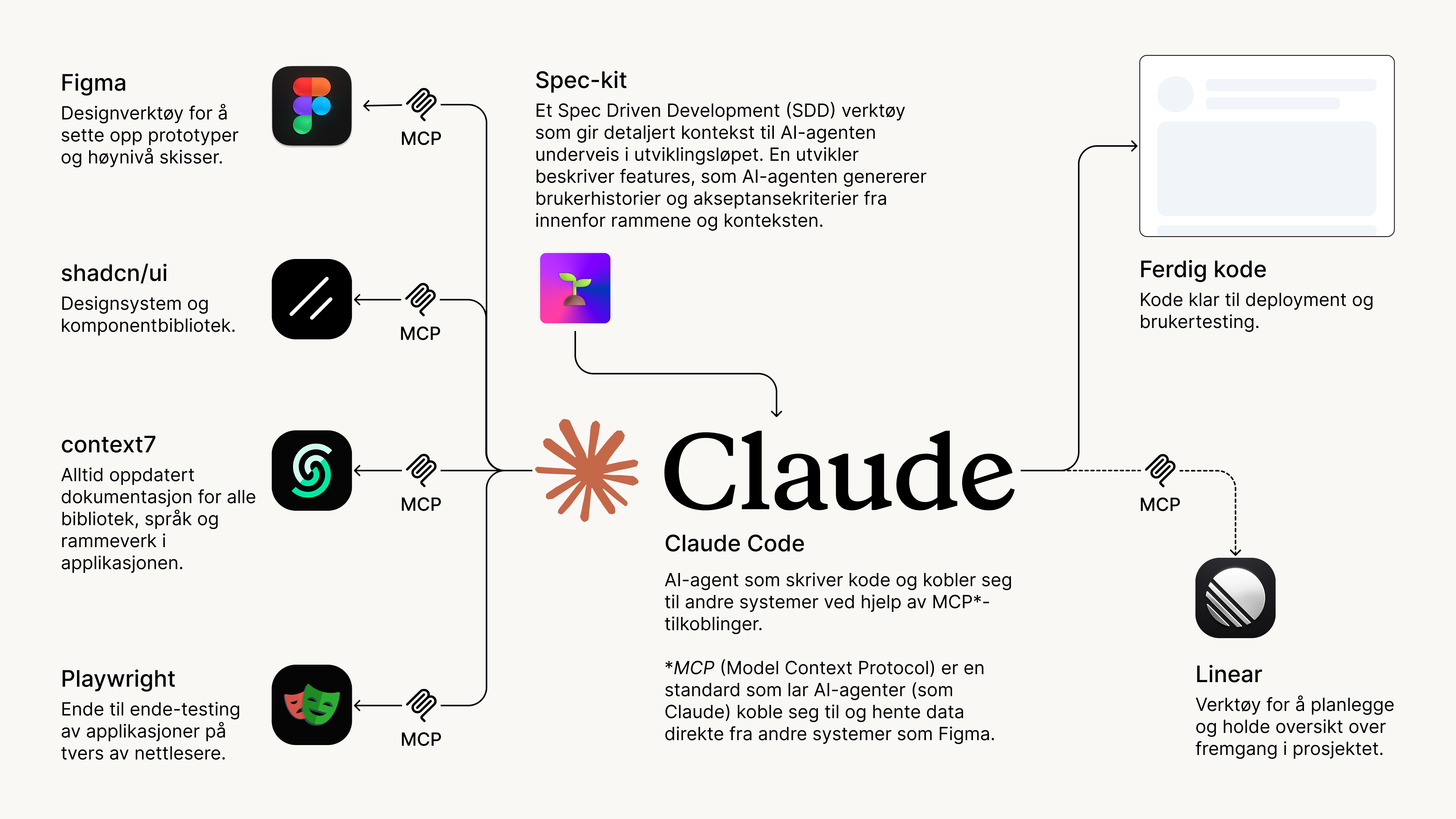 Når spesifikasjonen er tilstrekkelig moden, lar vi AI-agenten generere førsteutkast til kode og tester, og i noen tilfeller også dokumentasjon. For å gi agenten best mulig kontekst, bruker vi MCP-er til å tilgjengeliggjøre relevante data direkte fra verktøy som design- og kodebaser, i stedet for at agenten må gjette eller basere seg på antakelser og gamle treningsdata. Utviklernes rolle er fortsatt avgjørende: vi reviewer alt som produseres, justerer løsninger og oppdaterer spesifikasjonen når nye beslutninger tas. AI håndterer mye av det strukturelle arbeidet, mens mennesker har ansvar for kvalitet, helhet og videreutvikling.